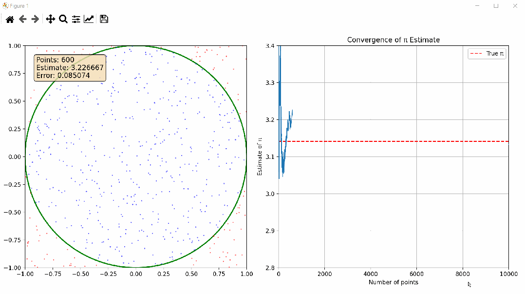 下图是NumPy通过蒙特卡洛方法估算圆周率π,并提供详细的代码实现和可视化,感兴趣可在后文根据详细注解一探究竟;